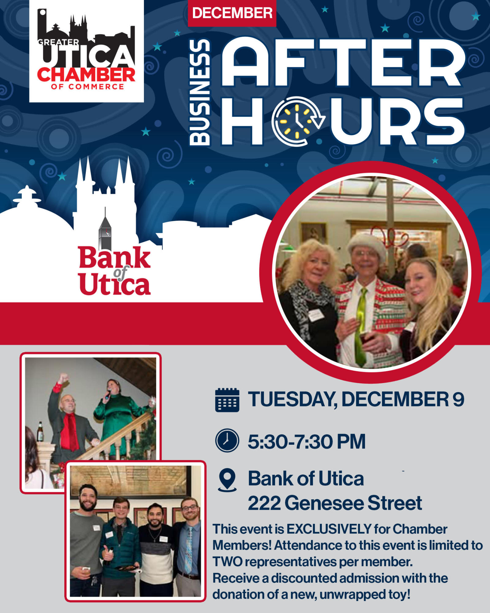 Join us for the annual Holiday Business After Hours hosted by Bank of Utica. This event is EXCLUSIVELY for Chamber Members! Attendance to this event is limited to TWO representatives per member. Receive a discounted admission with the donation of a new, unwrapped toy!