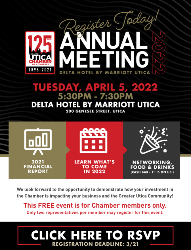 The Chamber's Annual Meeting is the opportunity for our Members to learn everything that the Chamber has been doing over the past year. We'll be offering food and you can enjoy your first beverage on us. The Annual Meeting presentation available for viewing for all of our members at that time. We are looking forward to celebrating with all of you!