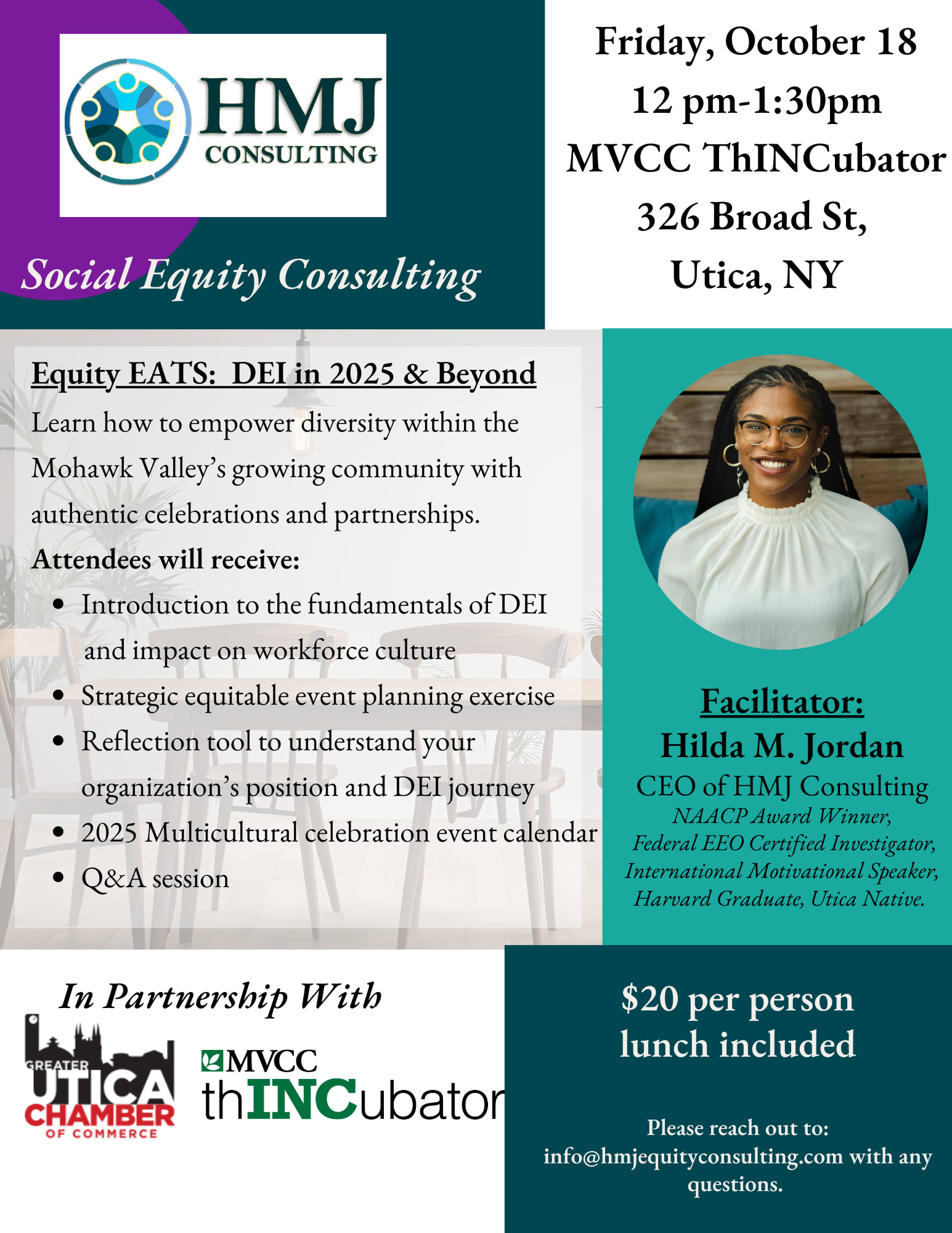 Please join us for a Lunch & Learn, facilitated by Hilda M. Jordan, CEO and Founder of HMJ Consulting. Learn how to empower diversity within the Mohawk Valley's growing community with authentic celebration and partnerships. Helpful for individuals who have started or are still interested in starting their DEI journey to better engage their workforce and stakeholders.
