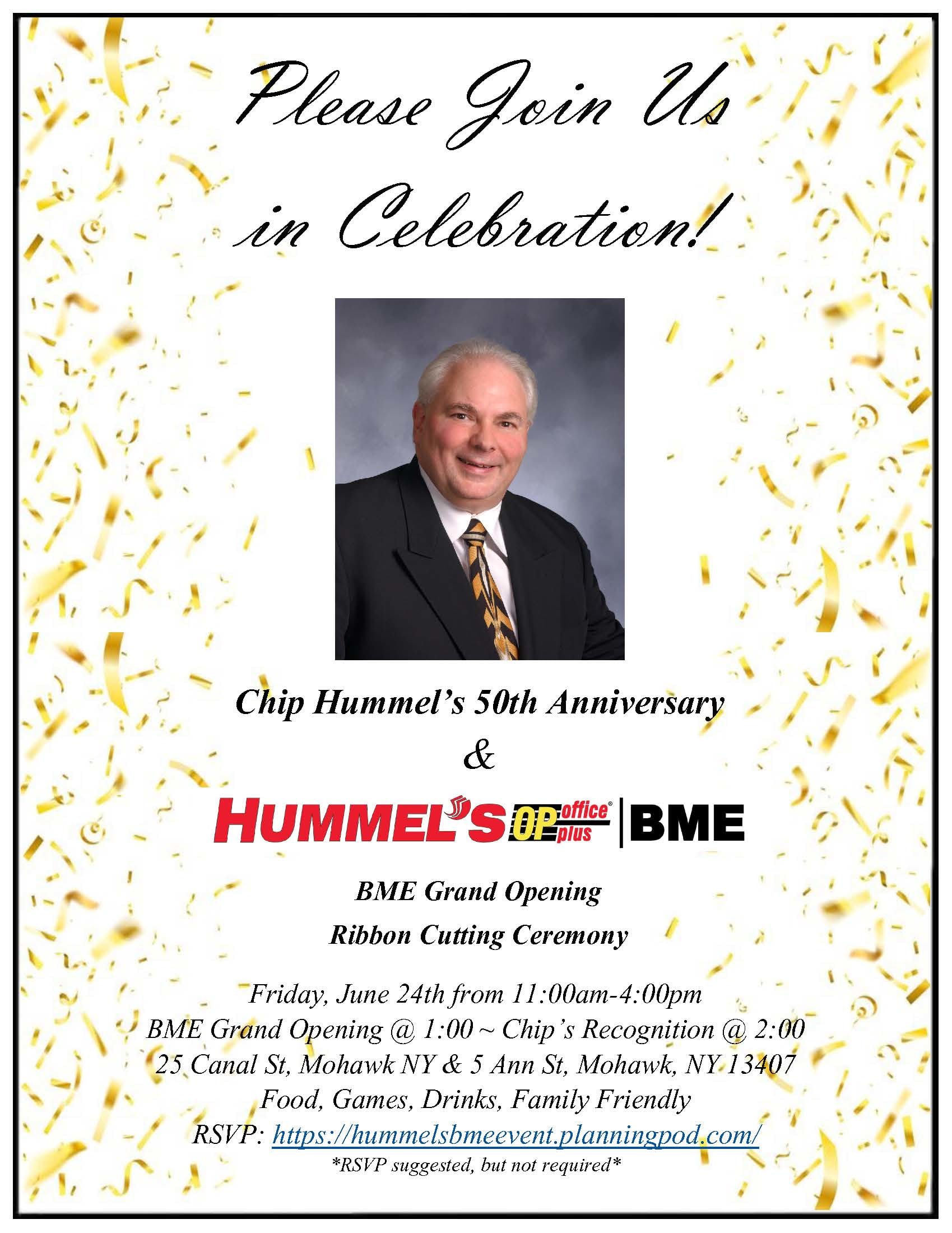 Come along as we join our friends at the Herkimer Chamber to celebrate the relocation of BME Company to their new offices in Mohawk and Chip Hummel's 50th Anniversary with Hummel's!
